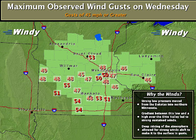 * Winds gust to 53 mph. at St. Cloud, 50 mph in the Twin Cities, gusts reach 54-56 mph. over much of southern Minnesota, strong enough to bring down trees and cause minor roof damage.