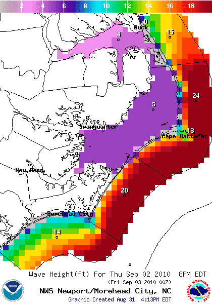 Potential Trouble. This is a NOAA graphic showing predicted wave heights hitting the Outer Banks of North Carolina by Thursday at 8 pm. 20-24 foot waves are possible (!) which would create the potential for devastating beach erosion and coastal flooding. Hurricane watches are now posted for much of coastal North Carolina, from Surf City to Duck.